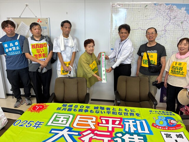 国民平和大行進が6月27日から7月14日まで大分県内で行われました。7月14日には中津市内で平和行進を行い、中津市役所を訪問されました。その後、福岡県へ引き渡しを行いました。