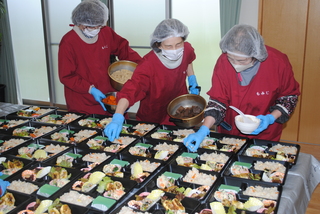 お弁当作りの1日は早い方は9時から集合され、準備を始めます。ご飯が完成して配食されるのが16時頃になります。