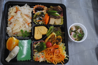 4月のお弁当は筍ご飯をメインに、ポテトサラダや春の食材を使った煮物、ナポリタン、コロッケにお吸い物、寒天などのデザートを含めた13種類の愛情のこもった豪華なお弁当となっています。