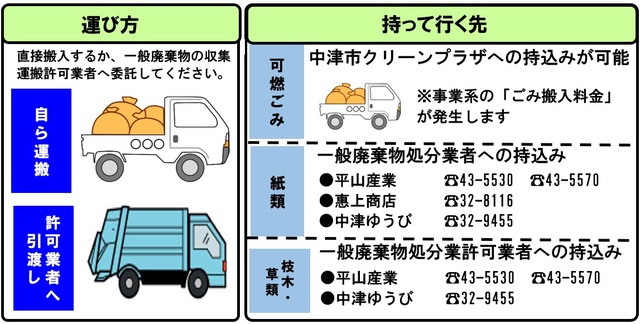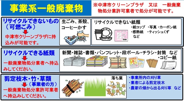 「事業系一般廃棄物」とは、事業活動に伴って生じた廃棄物(事業系ごみ)のうち、「産業廃棄物」に属さない廃棄物をいいます。「事業系一般廃棄物」のうち、一部は「中津市クリーンプラザ」に持込むことが可能です。「リサイクルできる紙類(新聞・雑誌・書類・パンフレット・段ボール等)」や「剪定枝木・竹・草類」については、一般廃棄物処分業者への持込みとなります。
