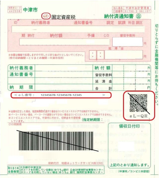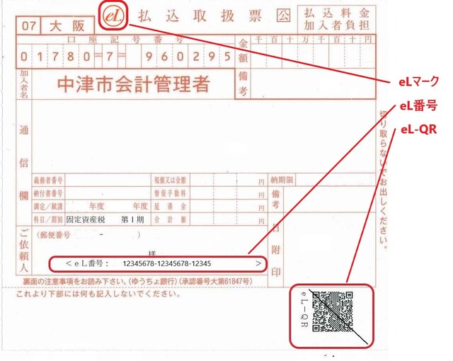 後記の税目において納付書に印字されておりますeL-QR(eL番号)をスマートフォン、パソコン等により読み取ることで納付が可能になります。また金融機関での現金納付も可能です。対応金融機関に関しましては「地方税お支払いサイト 共通納税対応金融機関」をご確認ください。