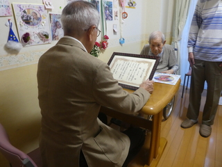 奥塚市長は、会話のひと時を楽しみながら長寿をお祝いしました。槇さん、これからもどうぞお元気で。