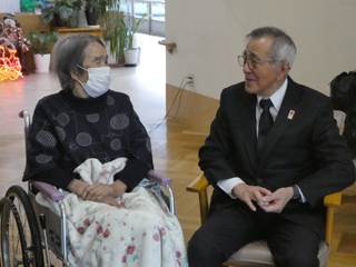 奥塚市長は、会話のひと時を楽しみながら長寿をお祝いしました。岩尾さん、これからもどうぞお元気で。