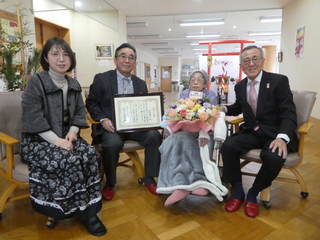 令和8年1月6日火曜日、百歳を迎えた北村 靜子さんのお祝いのため特別養護老人ホーム悠久の里を訪問し、お祝い状と記念品を贈りました。