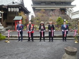 奥塚市長はあいさつで、庭園完成のお祝いと感謝を伝えるとともに、中津城の新たな試みが、市外から多くの方を引きつける磁力となることを期待しておりますなどと話しました。